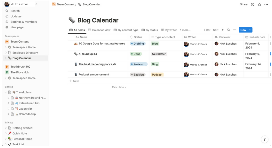 Notion isn’t a traditional marketing tool, but it’s excellent for organizing content, brainstorming, and managing content calendars. With AI integration, it can even help you write drafts for posts or blog articles.